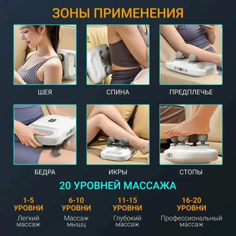 Получите индивидуальный подход к каждой мышце благодаря 4 специализированным насадкам в комплекте. Каждая из них разработана для точечного и прицельного воздействия на конкретные зоны — будь то напряженная шея, уставшая спина, ноги после тренировки или даже стопы. Это позволяет добиться максимального эффекта и ощутить результат профессионального массажа, не покидая уюта собственного дома.