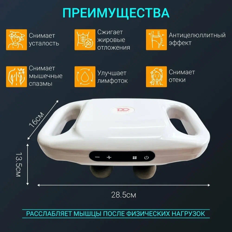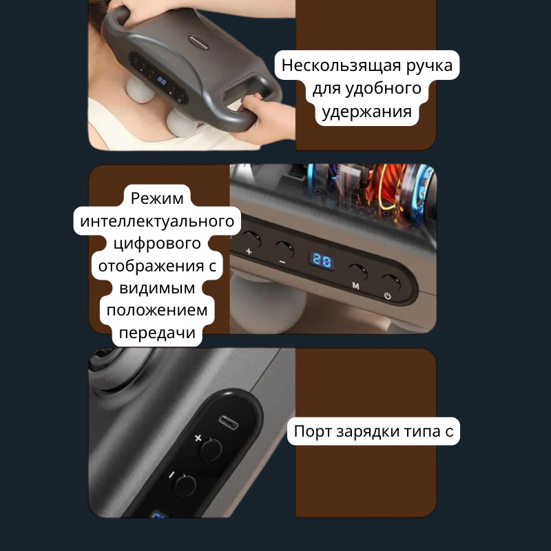 Забудьте о боли и усталости! Мощные и глубокие импульсы проникают в самые труднодоступные участки, эффективно снимая мышечные спазмы и зажимы. Массажер улучшает кровообращение, ускоряет восстановление после тренировок и помогает расслабиться после тяжелого рабочего дня.
